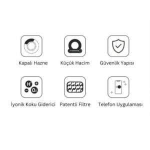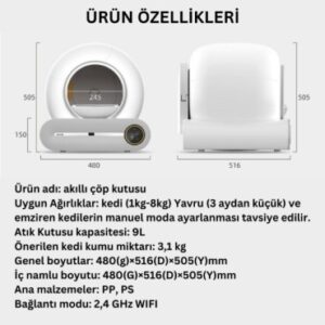 Akıllı Otomatik Kedi Tuvaleti, kedilerin tuvalet ihtiyacını hijyenik ve otomatik bir şekilde yönetmek için tasarlanmış bir üründür. Kapalı Hazne sistemi, hijyen sağlar ve kedinizin tuvalet alanını temiz tutar. Kompakt tasarımı sayesinde alan tasarrufu sağlar. Güvenlik yapısı, kedilerin güvenliğini sağlamak için özel olarak düşünülmüştür. İyonik koku giderici özelliği, kötü kokuları etkili bir şekilde ortadan kaldırır. Patentli filtreleme sistemi sayesinde daha temiz bir ortam sunar. Telefon uygulaması ile senkronize çalışarak, uzaktan kontrol imkanı sağlar. 2,4 GHz Wi-Fi bağlantısı desteği vardır, böylece kullanıcılar akıllı telefonları üzerinden kontrol edebilirler. PP (polipropilen) ve PS (polistiren) malzemeden imal edilmiştir. Bu akıllı kedi tuvaleti, kedilerin tuvaletini otomatik olarak temizler ve kullanımı kolay, hijyenik bir çözüm sunar.